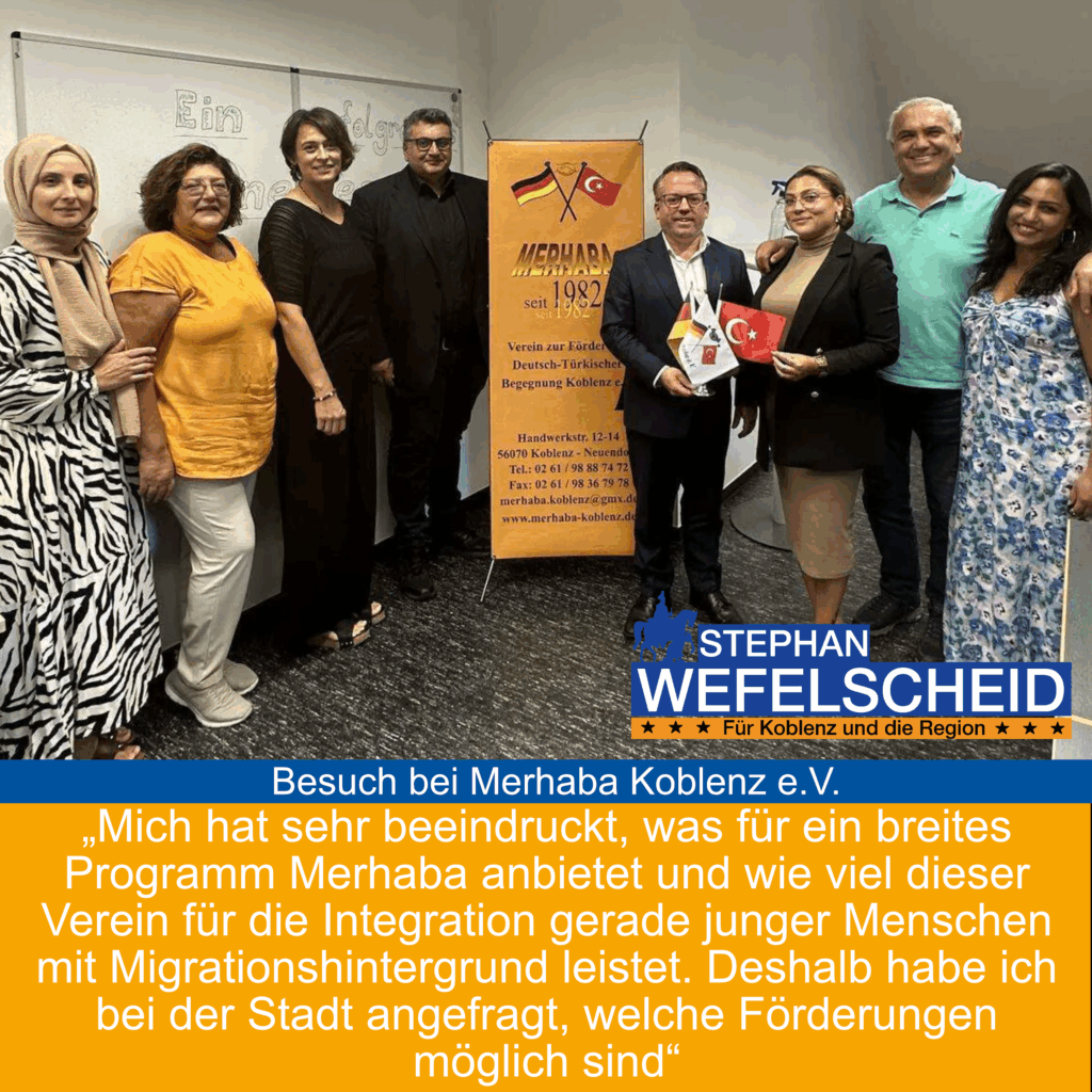 Wefelscheid beeindruckt von integrativer Leistung des Vereins – Verein habe noch viel Potenzial, brauche aber entsprechende Förderung Koblenz. Im Rahmen seiner Vereinsgespräche besuchte Stephan Wefelscheid, Landtagsabgeordneter und Vorsitzender der Stadtratsfraktion FREIE WÄHLER in Koblenz, den Verein „Merhaba – Verein zur Förderung deutsch-türkischer Begegnung e.V.“ , kurz Merhaba Koblenz e.V. „Merhaba“ ist türkisch und bedeutet übersetzt […]