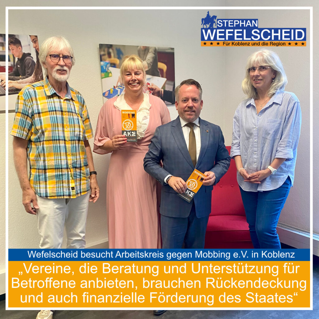 Landtagsabgeordneter besucht Arbeitskreis gegen Mobbing e.V. in Koblenz „Wenn Sie als Mann nur einen Meter sechsundfünfzig groß sind, dann erleben sie im Alltag schon, wie andere versuchen, Sie aufgrund der Körpergröße zu diskreditieren und herunterzumachen“, berichtete Stephan Wefelscheid, Landtagsabgeordneter und Vorsitzender der FREIE WÄHLER Stadtratsfraktion Koblenz, im Rahmen seines Austauschs mit dem Arbeitskreis gegen Mobbing