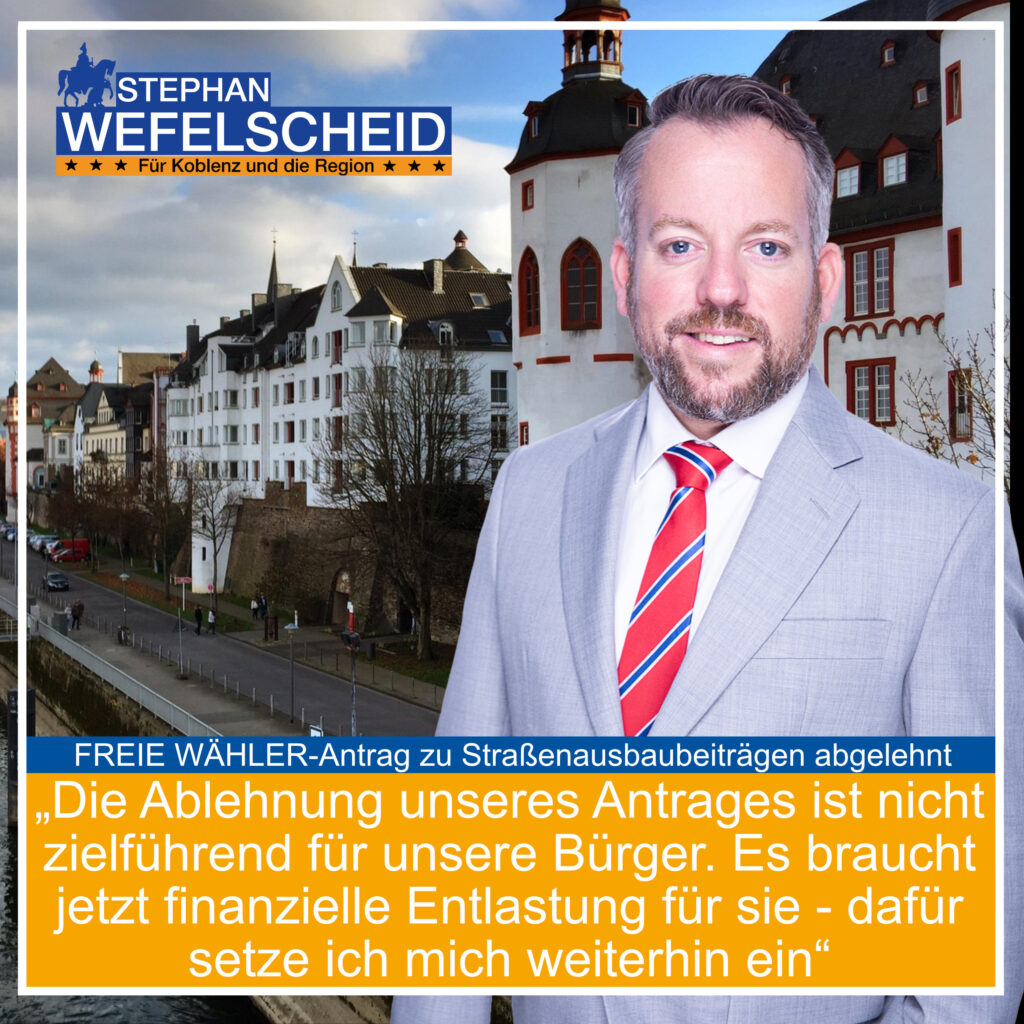 „Wenn Rheinland-Pfalz schon als einziges Bundesland an der verpflichtenden Erhebung von Straßenausbaubeiträgen festhält, dann muss wenigstens über die steuerliche Abschreibung eine Entlastung für Grundstückseigentümer geschaffen werden“, so Stephan Wefelscheid, Landtagsabgeordneter aus Koblenz. „Die Argumentation des Bundesfinanzhofs, wonach der „räumlich-funktionale Zusammenhang zum Haushalt des Steuerpflichtigen nicht gegeben sei“, halte ich für nicht stichhaltig. Denn gleichzeitig wird eben dieser Zusammenhang herangezogen um zu begründen, warum Anwohner überhaupt zur Beteiligung am Straßenausbau zu verpflichten sind.“
